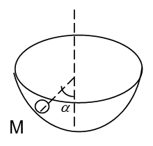Полусферическая чаша радиусом R вращается вокруг вертикальной оси с угловой скоростью ω. В чаше лежит шарик М, вращающийся вместе с нею. В каком месте чаши он находится? (Рассчитать угол α, который характеризует положение шарика). ![]()