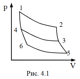 На рис 4.1 изображены два цикла Карно: 1-2-3-4-1 и 4-3-5-6-4. Процессы 6-4-1 и 2-3-5 адиабатные. Сравнить КПД циклов, если для температур изотермических процессов выполняется равенство Т12 - Т34 = Т34 - Т56.