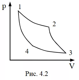 На диаграмме pV (рис. 4.2) изображен цикл Карно. Определить КПД цикла при условии, что в состояниях 1 и З отношения объемов V3/V1=2, а отношение давлений р13=1,5.