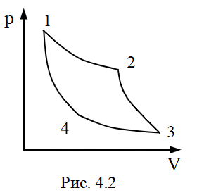 Тепловая машина работает по циклу Карно (рис. 4.2). Как изменится работа, совершаемая за цикл, если в качестве рабочего тела взять одноатомный газ вместо двухатомного? Состояния 1 и З в цикле не изменяются.