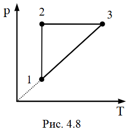 На диаграмме РТ изображен цикл, совершенный идеальным газом (рис. 4.8). Определить изменение энтропии газа на участках 1-2, 2-3, 3-1. Значения давления и температуры в состояниях 1, 2, З считать известными.