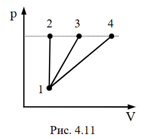 Идеальный газ переходит из состояния 1 в состояния 2, З, 4 (рис. 4.11). В каком процессе изменение энтропии будет максимально, а в каком минимально? ![]()