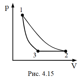 На диаграмме pV изображены процессы идеального газа (рис. 4.15). Процесс 1-2 — изотермический, 1-3 адиабатный, 3-2 — изобарный. Определить изменения энтропии газа в процессах 1-2 и 1-3-2. Значения давлений и объемов в состояниях 1,2,3 считать известными.
