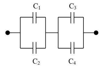 Четыре конденсатора С1 = 25 мкФ, С2 = 5 мкФ, С3 = 45 мкФ и С4 = 15 мкФ соединены между собой так, как показано на рисунке. Разность потенциалов на обкладках каждого конденсатора С1 равна 20 В. Найти заряды и разности потенциалов на обкладках каждого конденсатора, а также общий заряд и разность потенциалов на всей батарее конденсаторов.