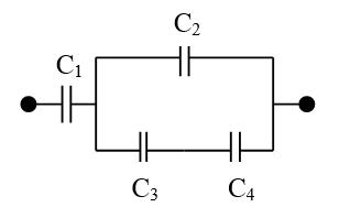 Четыре конденсатора С1 = 30 пФ, C2 = 12 пФ, С3 = 10 пФ и C4 = 40 пФ соединены между собой так, как показано на рисунке. Определить заряды конденсаторов и разности потенциалов между их обкладками, если разность потенциалов между точками А и В равна