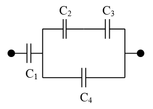 Четыре конденсатора С1 = 30 пФ, С2 = 12 пФ, С3 = 10 пФ и С4 = 40 пФ соединены между собой так, как показано на рисунке. Разность потенциалов на обкладках конденсатора С4 = 200 В. Найти заряды и разности потенциалов на обкладках каждого конденсатора