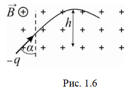 Электрон влетает в область однородного магнитного поля с индукцией 103 Тл (рис. 1.6). Направление вектора скорости электрона перпендикулярно силовым линиям поля. Определить скорость электрона, если глубина проникновения в область магнитного поля h =