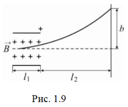 линиям электрического поля (рис. 1.9). Длина отклоняющей системы l1 = 50 мм. Расстояние от отклоняющей системы до экрана l2 = 175 мм. Под действием электрического поля пучок сместился на экране на расстояние Ь = 5 мм. Включение магнитного поля с индукцией В = 3,7*104 Тл возвращает пучок в первоначальную точку. Определить из приведенных данных удельный заряд электрона.