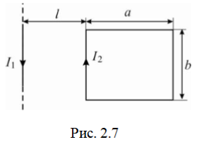 По длинному прямому проводнику течет ток l1. Рядом с этим проводником расположена прямоугольная рамка со сторонами Ь и а, по которой течет ток l2. Ближайшая сторона рамки находится на расстоянии l от проводника (рис. 2.7). Определить силу, действующу