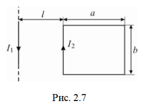 По длинному прямолинейному проводнику течет ток I. Рядом с этим проводником расположена прямоугольная рамка так, как изображено на рис. 2.7. Вычислить магнитный поток, пронизывающий рамку.