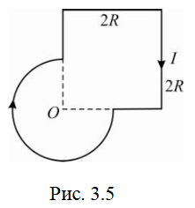 Ток 20 А течет по контуру, изображенному на рис. 3.5, где R = 0,1 м. Определить индукцию магнитного поля тока в точке О контура.