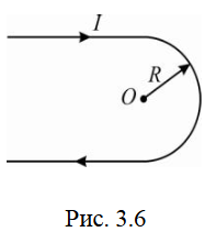 Длинный проводник, по которому течёт ток 15 А, имеет вид, показанный на рис. 3.6. Радиус полуокружности R = 20 см. Определить индукцию магнитного поля тока в точке О.