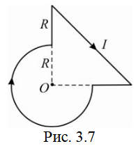Задача 3: Ток в контуре, показанном на рис. 3.7, равен 5 А. Вычислить индукцию магнитного поля тока в точке О, если R = 10 cм.