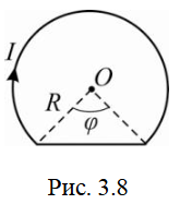 Ток в контуре, показанного на рис. 3.8, равен 10 А, R = 20 см, φ = 1200. Определить индукцию магнитного поля тока в точке О. ![]()