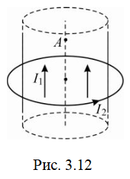 Ток 10 А равномерно распределен по сечению длинного цилиндра радиусом 5 см. Ток 20 А течет по тонкому кольцу радиусом 10 см, ось которого совпадает с осью цилиндра (рис. 3.12). Найти индукцию магнитного поля токов в точке А на оси цилиндра, отстоящей на расстоянии 10 см от плоскости кольца. ![]()
