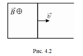 Проводник, имеющий П-образную форму (рис. 4.2) лежит на горизонтальной плоскости и находится в однородном магнитном поле, индукция которого изменяется с постоянной скоростью dB/dt = 0,06 Тл/с. Силовые линии поля перпендикулярны плоскости проводника. Вдоль параллельных сторон этого проводника перемещают без начальной скорости проводник-перемычку с ускорением 0,2 м/с2 Длина перемычки 0,1 м. Найти ЭДС индукции в контуре через 4 с после начала перемещения. Принять, что в начальный момент площадь контура и индукция магнитного поля равны нулю. Индуктивностью контура пренебречь.