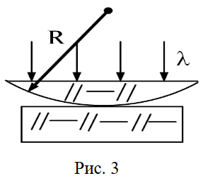 Интерференционные кольца Ньютона образуются в установке, состоящей из плоского стекла и линзы с радиусом кривизны 8,6 м. Монохроматический свет падает по нормали к горизонтальной поверхности линзы (рис. З). Диаметр четвертого темного кольца, считая ц