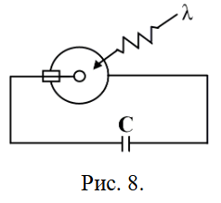 В сферическом сосуде, из которого откачан воздух, помещены два электрода из цинка. К ним подсоединён конденсатор ёмкостью с=3,5 мкФ (рис. 8). Один из электродов освещается светом с длиной волны λ=0,25 мкм. Какой заряд будет находиться на конденсаторе