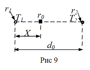 Два абсолютно черных шарика радиусами r1=4 см и r22 см, имеющие постоянные температуры Т1=400 К и Т2=800 К, находятся в вакууме на расстоянии d0=0,6 м. Между шариками помещена небольшая пластинка радиусом r0<<d0,, плоскость которой перпендикулярна к прямой, соединяющей шарики (рис. 9). Пластинка обладает свойствами черного тела. На каком расстоянии Х от первого шарика надо поместить пластинку, чтобы ее температура была наименьшей? Каково значение этой температуры? Фоном излучения от окружающих предметов пренебречь.