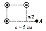 Электрическое поле в вакууме создается системой одинаковых по модулю точечных электрических зарядов (см. рисунок). а) Найдите напряженность ЕА и потенциал φА электростатического поля, которое создает в точке А система точечных электрических зарядов, если модули всех зарядов одинаковы и равны |𝒒|= 1𝟎 нКл. б) Определите энергию W системы электрических зарядов. Как изменится энергия, если в точку А поместить заряд 𝒒𝟎 = 𝟐 нКл?