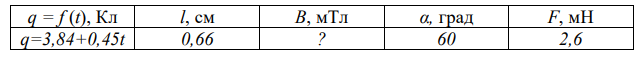 Между полюсами электромагнита создается однородное магнитное поле, индукция которого равна В. По проводу длиной l, расположенному между полюсами электромагнита под углом α к силовым линиям, за время t проходит количество электричества, определяемое законом q = f(t). Сила, действующая при этом на провод, равна F. Найти неизвестную величину согласно номеру задания в таблице.