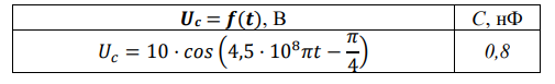 Уравнение изменения со временем разности потенциалов на обкладках конденсатора в колебательном контуре дано в виде 𝑼𝒄 = 𝒇(𝒕). Емкость конденсатора равна С. Записать закон изменения заряда на обкладках конденсатора и силы тока в контуре. Определить период колебаний в контуре Т, индуктивность контура L, максимальный заряд конденсатора qmax, длину волны, излучаемой контуром λ.