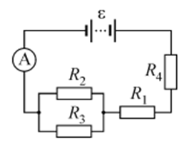 ЭДС батареи e = 120 В, сопротивления R3 = 20 Ом, R4 = 25 Ом (рисунок). Падение напряжения на сопротивлении R1 U1 = 40 В. Амперметр показывает ток I = 2 А. Найдите сопротивление R2.