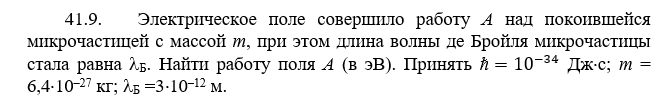 Электрическое поле совершило работу А над покоившейся микрочастицей с массой m, при этом длина волны де Бройля микрочастицы стала равна lБ. Найти работу поля А (в эВ). Принять Дж×c; m = 6,4×10–27 кг; lБ =3×10–12 м.