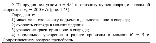 4) нормальное ускорение и радиус кривизны в момент t0 = 5 c. Сопротивлением воздуха пренебречь.