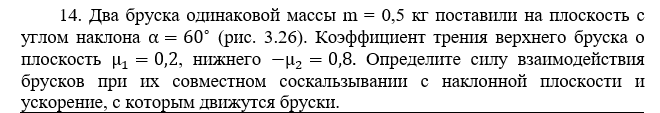 Два бруска одинаковой массы m = 0,5 кг поставили на плоскость с углом наклона (рис. 3.26). Коэффициент трения верхнего бруска о плоскость , нижнего Определите силу взаимодействия брусков при их совместном соскальзывании с наклонной плоскости и ускорение, с которым движутся бруски.