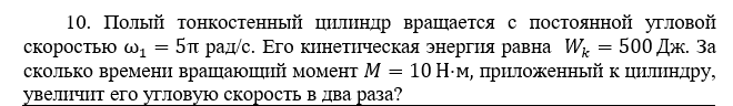 Полый тонкостенный цилиндр вращается с постоянной угловой скоростью рад/с. Его кинетическая энергия равна . За сколько времени вращающий момент приложенный к цилиндру, увеличит его угловую скорость в два раза?