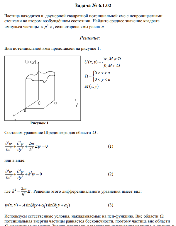 Частица находится в двумерной квадратной потенциальной яме с непроницаемыми стенками во втором возбужденном состоянии. Найдите среднее значение квадрата импульса частицы   2 p , если сторона ямы равна a ..