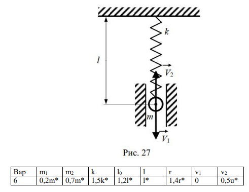 Дополнительно (в соответствии с общими условиями задачи 3) рассчитать все требуемые величины и вывести уравнение затухающих колебаний вертикального пружинного маятника (см. рис. 27), у которого масса шарика равна m = m1, а длина и жёсткость пружины равны соответственно l0 и k (см. табл.9). В начальный момент времени шарик смещают так, что длина пружины становится равной l, а затем кратковременным воздействием сообщают скорость v1 или v2 . В результате система приходит в колебательное движение в вертикальном направлении. Трением шарика о боковую поверхность пренебречь.