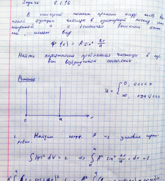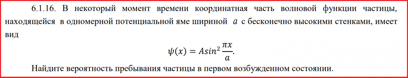 В некоторый момент времени координатная часть волновой функции частицы, находящейся в одномерной потенциальной яме шириной a с бесконечно высокими стенками, имеет вид 𝜓(𝑥) = 𝐴𝑠𝑖𝑛2 𝜋𝑥 𝑎 . Найдите вероятность пребывания частицы в первом возбужденном состоянии..