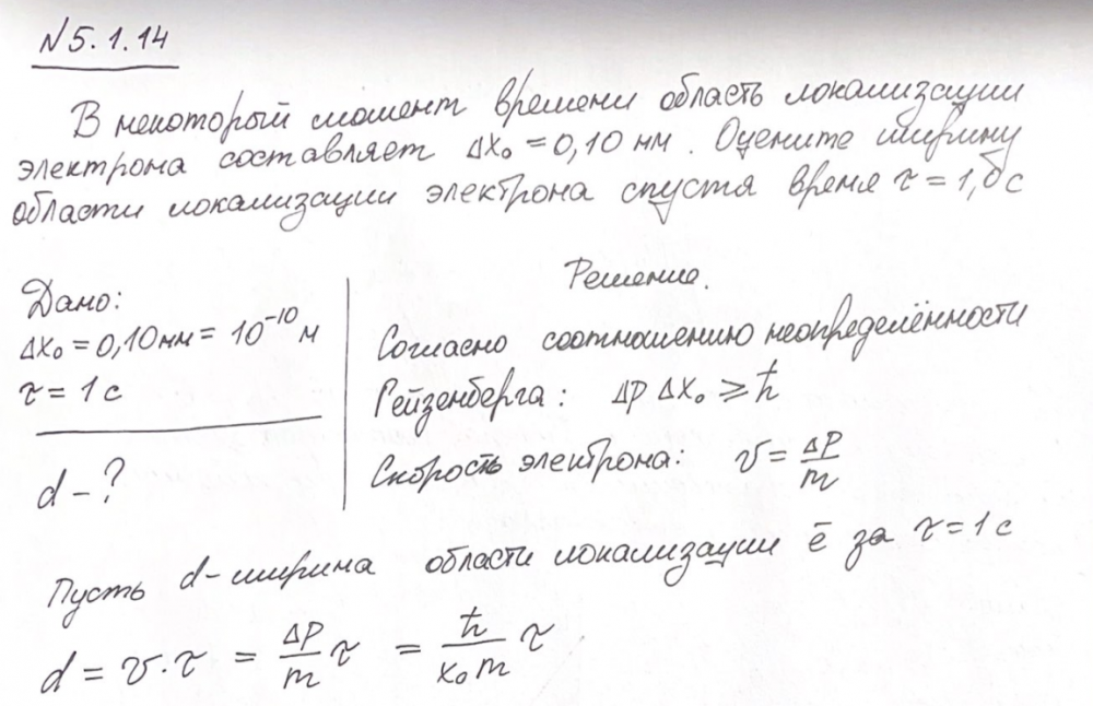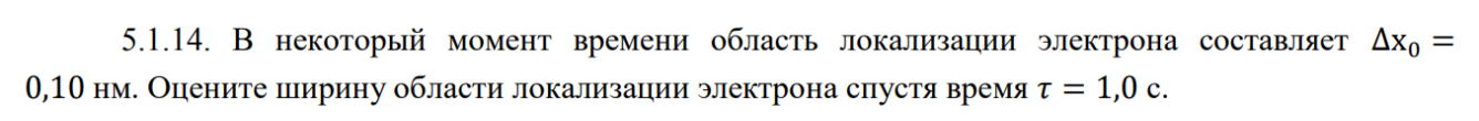 5.1.14. В некоторый момент времени область локализации электрона составляет Δx0 = 0,10 нм. Оцените ширину области локализации электрона спустя время 𝜏 = 1,0 с..