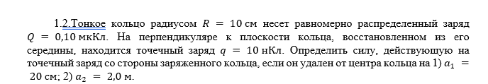 Тонкое кольцо радиусом несет равномерно распределенный заряд . На перпендикуляре к плоскости кольца, восстановленном из его середины, находится точечный заряд . Определить силу, действующую на точечный заряд со стороны заряженного кольца, если он удален от центра кольца на 1) ; 2) .