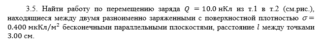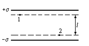 Найти работу по перемещению заряда из т.1 в т.2 (см.рис.), находящиеся между двумя разноименно заряженными с поверхностной плотностью бесконечными параллельными плоскостями, расстояние между точками .