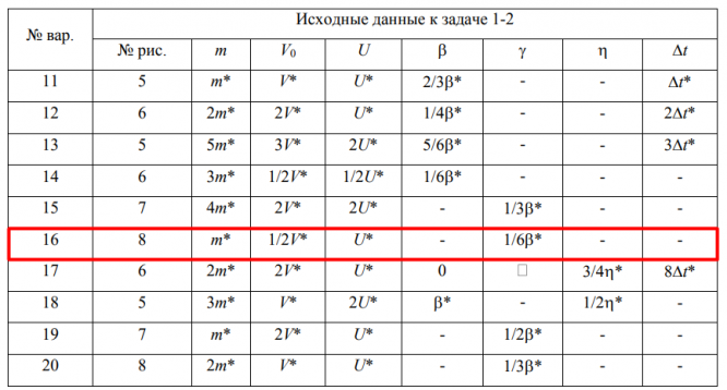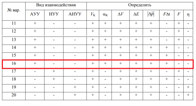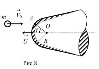 Гладкая частица сферической формы массой m, которую можно рассматривать как материальную точку, ударяется со скоростью V0  о гладкую массивную преграду, которая движется со скоростью U const  . Угол, образованный векторами V0  и U  , равен . Массу преграды считать бесконечной. На рис. 5, 6 преграда имеет форму плоской стенки, на рис.7 – форму острого конуса с углом раствора γ, а на рис. 8 – форму конуса сферической головной частью радиусом R. Удар частицы о сферическую поверхность происходит в точке А, расположенной под углом γ относительно оси преграды. При этом АО = R. Виды взаимодействия: а) абсолютно упругий удар (АУУ); б) неупругий удар (НУУ); в) абсолютно неупругий удар (АНУУ). Обозначения: VK  - конечная скорость частицы после удара; K - угол, образованный векторами VK  и U  ; V   - изменение вектора скорости частицы за время удара; p   - изменение модуля импульса частицы за время удара; E - изменение кинетической энергии частицы за время удара;