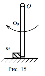Однородный жёсткий стержень длиной l=0,5 м и массой М=0,5 кг может свободно без трения вращаться вокруг горизонтальной оси О. При прохождении стержнем вертикального положения с угловой скоростью 0 , он своим нижним концом ударяет по маленькому кубику массой m=0,1 кг, который после удара движется в плоскости рисунка (рис. 15). При этом взаимодействие стержня с кубиком может происходить в виде: абсолютно упругого удара (АУУ); неупругого удара (НУУ); абсолютно неупругого удара (АНУУ). Другие обозначения: 0 – угловая скорость стержня сразу после взаимодействия с кубиком; 0m – минимальная угловая скорость 0, при которой стержень после удара совершит полный оборот вокруг оси O при заданном типе взаимодействия;