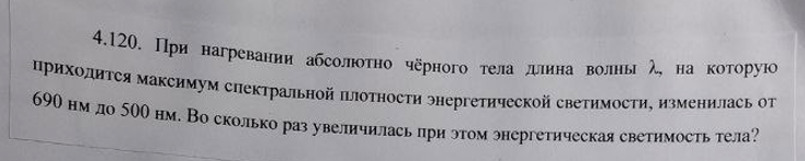 При нагревании абсолютно чёрного тела длина волны А, на которую приходится максимум спектральной плотности энергетической светимости, изменилась от 690 нм до 500 нм. Во сколько раз увеличилась при этом энергетическая светимость тела?