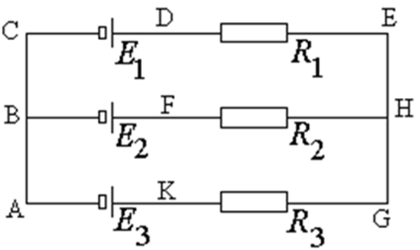 Три источника с ЭДС E1 = 9.0 В, E2 = 6.0 В, E3 = 5.0 В и внутренними сопротивлениями r1 = 0.1 Ом, r2 = 0.2 Ом, r3 = 0.3 Ом соединены, как показано на рисунке 9. Определить напряжение на резисторах сопротивлениями R1 = 5.0 Ом, R2 = 2.0 Ом, R3= 3.0 Ом. Построить график падения потенциала вдоль замкнутого контура ABFHGKA.