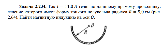 Задача 2.234. Ток 𝐼 = 11.0 𝐴 течет по длинному прямому проводнику, сечение которого имеет форму тонкого полукольца радиуса 𝑅 = 5,0 см (рис. 2.64). Найти магнитную индукцию на оси 𝑂.