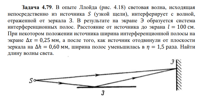 В опыте Ллойда (рис. 4.18) световая волна, исходящая непосредственно из источника 𝑆 (узкой щели), интерферирует с волной, отраженной от зеркала З. В результате на экране Э образуется система интерференционных полос. Расстояние от источника до экрана 𝑙 = 100 см. При некотором положении источника ширина интерференционной полосы на экране ∆𝑥 = 0,25 мм, а после того, как источник отодвинули от плоскости зеркала на ∆ℎ = 0,60 мм, ширина полос уменьшилась в 𝜂 = 1,5 раза. Найти длину волны света.