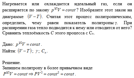 Нагревается или охлаждается идеальный газ, если он расширяется по закону ? Изобразите этот закон на диаграмме . Считая этот процесс политропическим, определить, чему равен показатель политропы γ. При расширении газа тепло подводится к нему или отводится от него? Сравнить теплоёмкость С этого процесса с Сv.