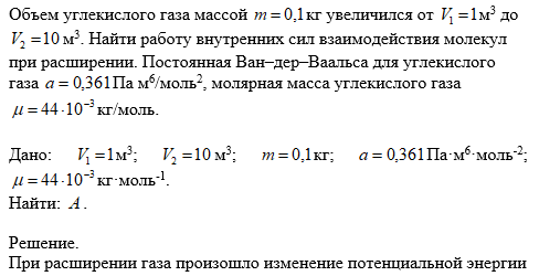 Объем углекислого газа массой кг увеличился от м3 до м3. Найти работу внутренних сил взаимодействия молекул при расширении. Постоянная Ван–дер–Ваальса для углекислого газа Па м6/моль2, молярная масса углекислого газа кг/моль.