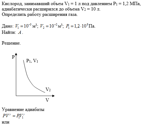 Кислород, занимавший объем V1 = 1 л под давлением Р1 = 1,2 МПа, адиабатически расширился до объема V2 = 10 л.