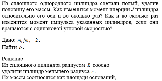 Из сплошного однородного цилиндра сделали полый, удалив половину его массы. Как изменится момент инерции J цилиндра относительно его оси и во сколько раз? Как и во сколько раз изменится момент импульса указанных цилиндров, если они вращаются с одинаковой угловой скоростью?