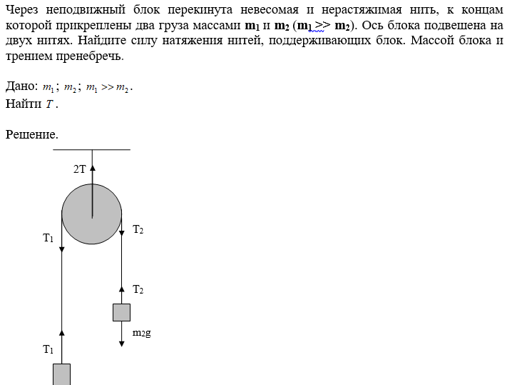 Через неподвижный блок перекинута невесомая и нерастяжимая нить, к концам которой прикреплены два груза массами m1 и m2 (m1 >> m2). Ось блока подвешена на двух нитях. Найдите силу натяжения нитей, поддерживающих блок. Массой блока и трением пренебречь.