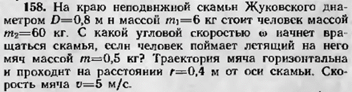 158. На краю неподвижной скамьи Жуковского диаметром (D = 0{,}8) м и массой (m_1 = 6) кг стоит человек массой (m_2 = 60) кг. С какой угловой скоростью (omega) начнет вращаться скамья, если человек поймает летящий на него мяч массой (m = 0{,}5) кг? Траектория мяча горизонтальна и проходит на расстоянии (r = 0{,}4) м от оси скамьи. Скорость мяча (v = 5) м/с.