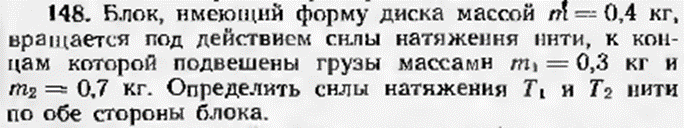 148.Блок, имеющий форму диска массой (m = 0{,}4) кг, вращается под действием силы натяжения нити, к концам которой подвешены грузы массами (m_1 = 0{,}3) кг и (m_2 = 0{,}7) кг. Определить силы натяжения (T_1) и (T_2) нити по обе стороны блока.